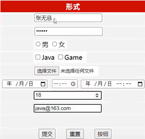 submit/reset/button定义提交按钮/重置按钮/可点击按钮,不能带 name,防止 value 提交给服务器